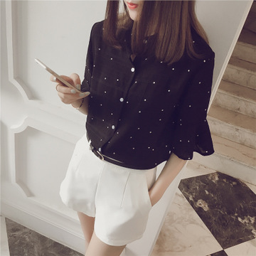 新款韓版波點立領喇叭袖雪紡襯衫上衣女 /