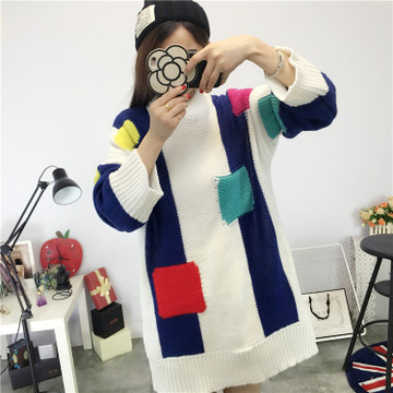 毛衣女秋冬韓版時尚拼色圓領套頭針織衫中長款寬松大碼毛線連衣裙 /