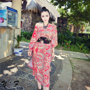 優雅民族風V領側開叉性感印花連衣裙+復古桃花腰封套裝 /
