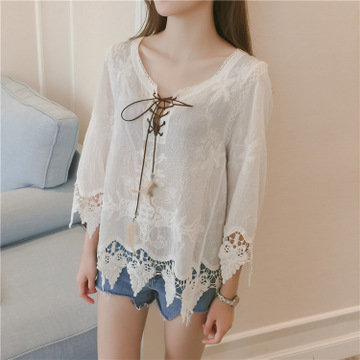 秋裝新款系帶領褶皺蕾絲衫鏤空繡花七分袖T恤 /