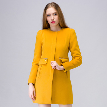 冬季新品中長款長袖羊毛外套女歐美通勤呢子大衣風衣黃色 /