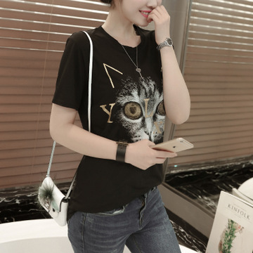 實拍夏裝新款韓版寬松學院風字母卡通印花貓咪短袖T恤女學生 /
