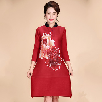 春秋季新款高溫定型印花立領三宅壓皺中長款七分袖連衣裙媽媽裝 /