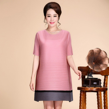 夏季新款圓領套頭拼接三宅壓皺中長款短袖連衣裙媽媽裝 /