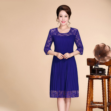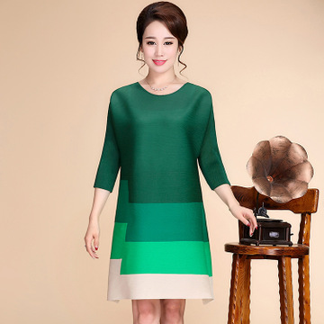 春夏季新款圓領套頭拼接三宅壓皺中長款七分袖連衣裙媽媽裝 /