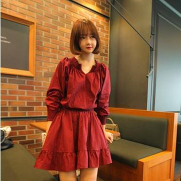 夏季新品酒紅色松緊裙復古文藝立領OL范連衣裙滌綸裙子 /