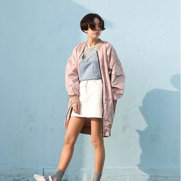 韓版秋季新款純色棒球女式外套中長款寬松大碼拉鏈口袋上衣 /