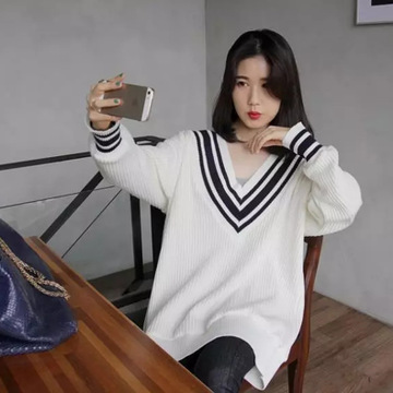 秋冬新款V領毛衣女寬松棒球純棉線羅紋毛衣學院風針織線衣 /