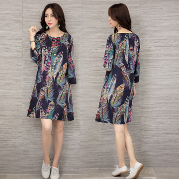 秋裝新款棉麻印花民族風大碼女裝長袖連衣裙 /