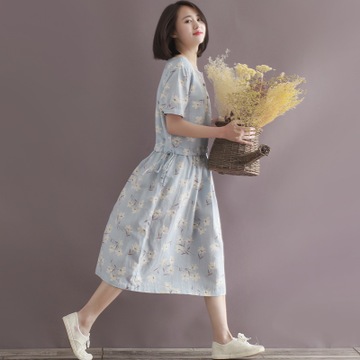 模特實拍文藝小清新收腰顯瘦印花連衣裙棉麻短袖女裝夏 /