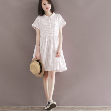 模特實拍海軍風文藝復古細條紋棉布短袖連衣裙 /