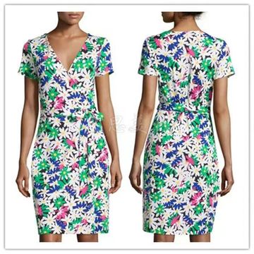歐美大牌原單早秋新款DVF五彩菊花顯瘦真絲針織裹身連衣裙女 /