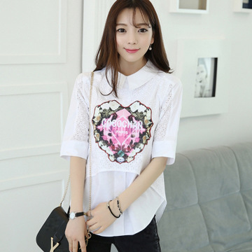 實拍秋裝新款韓版上衣女繡花中袖寬松大碼胖MM襯衫 /