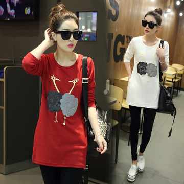 實拍秋裝新款韓版長袖印花t恤修身中長款時尚打底衫女 /