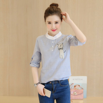 卡通刺繡條紋拼接襯衣長(zhǎng)袖立領(lǐng)打底衫韓范寬松學(xué)院風(fēng)繡花襯衫 /