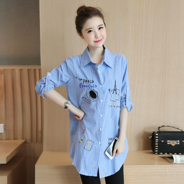 現(xiàn)貨 可愛(ài)刺繡卡通漫畫(huà)條紋襯衣萌萌個(gè)性休閑百搭中長(zhǎng)款襯衣 /