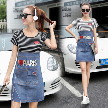 夏季款韓版修身顯瘦中長款純棉條紋短袖拼接時尚薄牛仔連衣裙 /