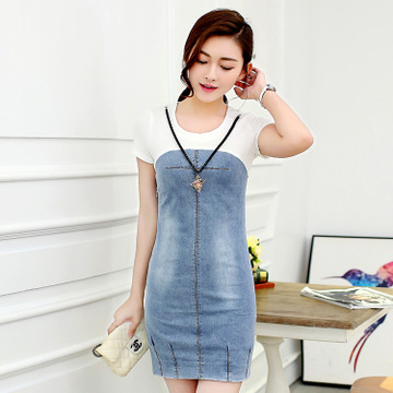 韓版夏裝新款修身短袖拼接牛仔連衣裙顯瘦休閑A字裙包臀中裙 /