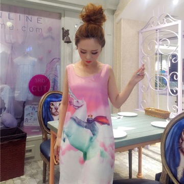 實(shí)拍歐洲站夏季寬松韓版無(wú)袖連衣裙卡通印花涂鴉背心女 /
