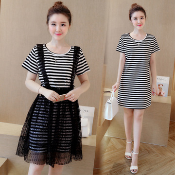 誠招代理夏裝新款韓版胖mm大碼條紋T恤+蕾絲背帶裙兩件套 /