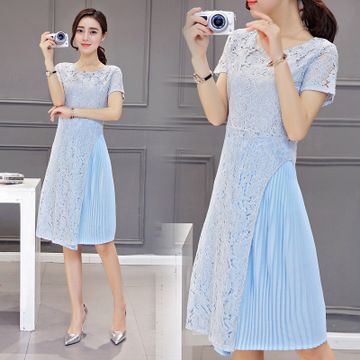 誠招代理夏季新款韓版修身短袖蕾絲拼接雪紡連衣裙 潮 /