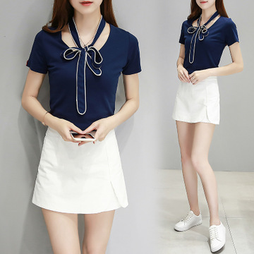新款套裝女夏季韓版氣質時尚新款蝴蝶結系帶上衣+裙褲兩件套 /