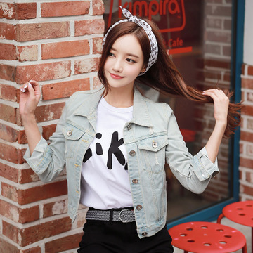 牛仔外套女秋款洗水長袖牛仔衣時尚百搭修身破洞短款牛仔外套 /