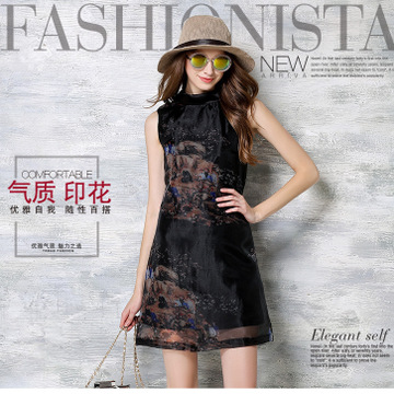 代發新款女裝高領無袖山水中國風印花包臀打底連衣裙 /