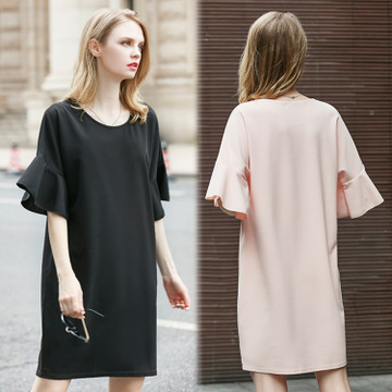歐美大碼女裝 胖MM加肥加大時尚荷葉袖純色連衣裙 /