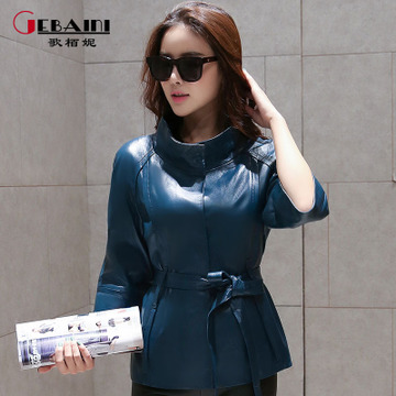 歌栢妮秋冬新款綿羊皮真皮皮衣女短款單皮系帶立領七分袖外套 /