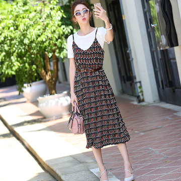 淘寶女裝一件代發雪紡吊帶印花 連衣裙海邊度假碎花沙灘百褶裙 /