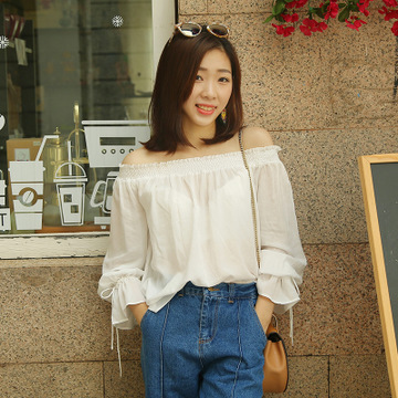 春夏新款韓版寬松一字領打底衣系帶七分泡泡袖雪紡女上衣 /