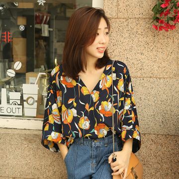 春夏新款macyrel復古雪紡時尚V領寬松喇叭袖上衣 /