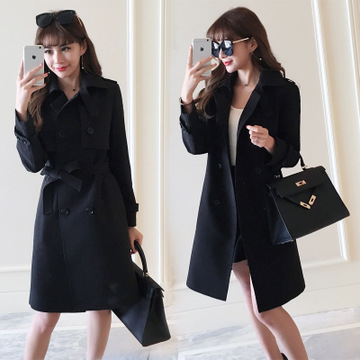 黑色腰帶肩章春秋裝翻領修身顯瘦長袖女式風衣外套 /