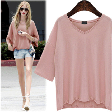 歐洲站夏季新款寬松大碼七分袖T恤歐美女裝時尚V領打底衫上衣 /