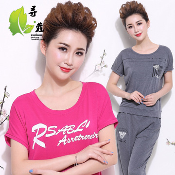 中年短袖運動套裝休閑寬松媽媽裝兩件套30-40歲印花T恤+九分褲女 /