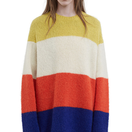 秋冬新款歐美彩虹撞色條紋馬海毛套頭圓領(lǐng)慵懶寬松毛衣女潮針織衫 /