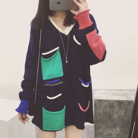 東大門秋冬新款 韓版寬松多彩拼接口袋中長款針織衫減齡v領毛衣女 /