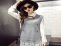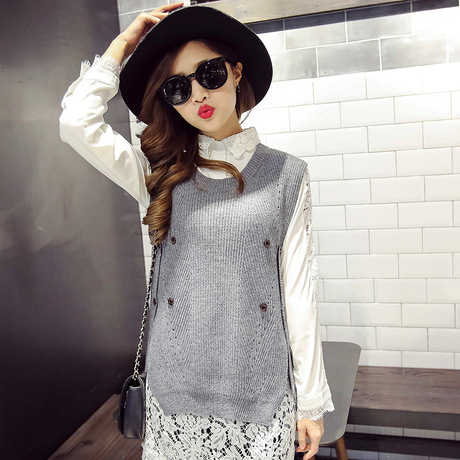 春裝新品側(cè)系扣羊絨無(wú)袖馬甲圓領(lǐng)針織開(kāi)衫前短后長(zhǎng)開(kāi)衩羊毛衫 /