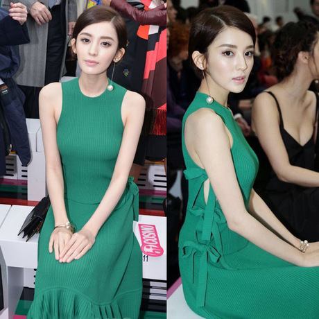 春夏古力娜扎米蘭時裝周明星同款綠色無袖連衣裙大擺長裙套裝裙 /