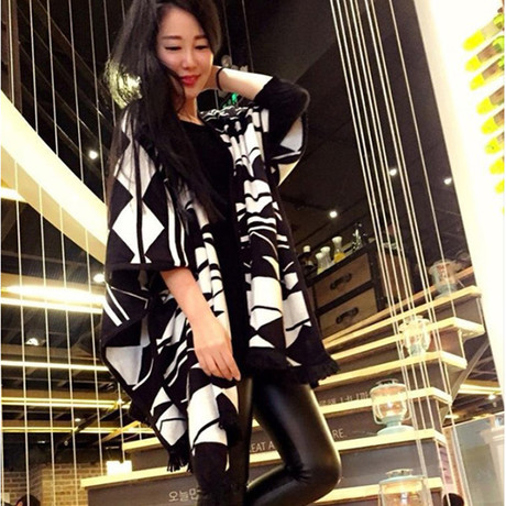 歐洲站秋裝新款左岸瀟同款黑白格紋流蘇斗蓬披肩外套針織開衫 /