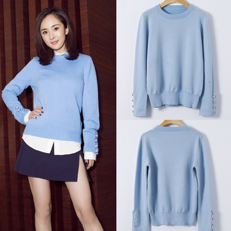 秋季新款楊冪生日同款藍(lán)色套頭長(zhǎng)袖寬松毛衣女毛衫上衣 /