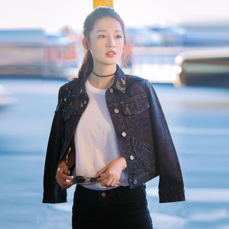 秋季新款時(shí)裝周李沁同款MJ時(shí)尚米奇繡花長(zhǎng)袖黑色牛仔外套女 /