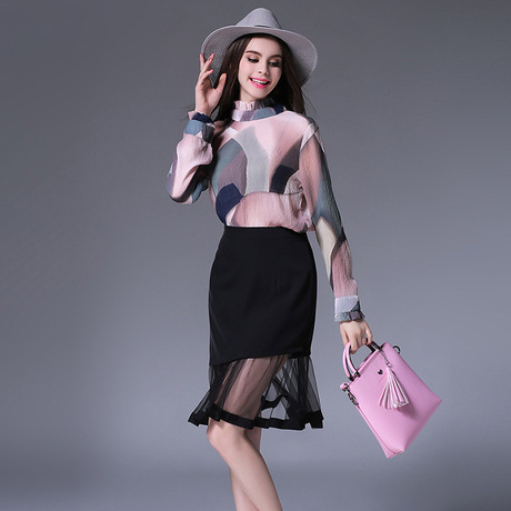 歐美女裝秋季新款優雅套裝印花拼接長袖雪紡衫+魚尾紗網中裙 /