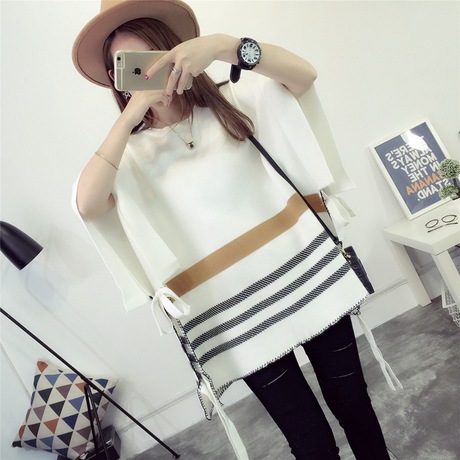 韓國東大門秋季新款條紋帶子披肩針織衫女韓版寬松顯瘦外套毛衣女 /
