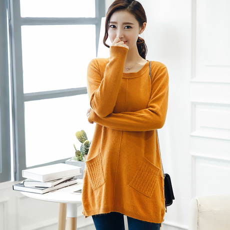 秋冬新款女圓領羊絨衫中長款休閑帶兜毛衣修身套頭針織兔絨打底衫 /