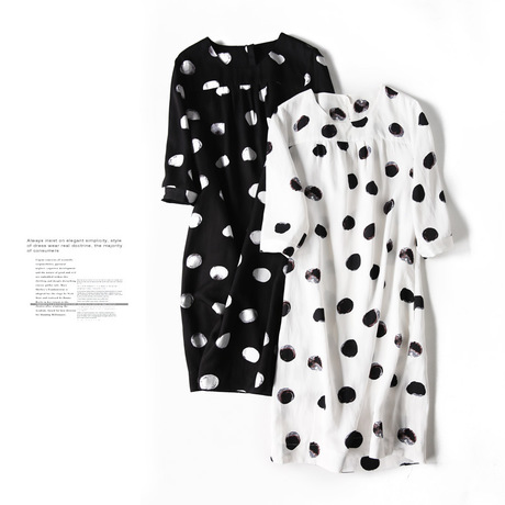 春季新品女裝裙子簡約百搭顯瘦大波點圓領七分袖連衣裙中裙 /