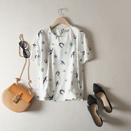 快樂家同款 后背扣子 高支純棉 數碼小鳥印花 圓領連肩袖直筒T恤 /