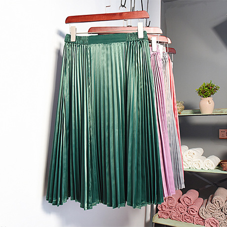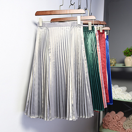 新款裙子韓國街頭感歐美街拍氣質(zhì)金屬色百褶裙長裙半身裙 /