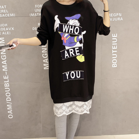 模特實拍秋裝韓版新款唐老鴨貼布蕾絲拼接衛衣裙連衣裙 /